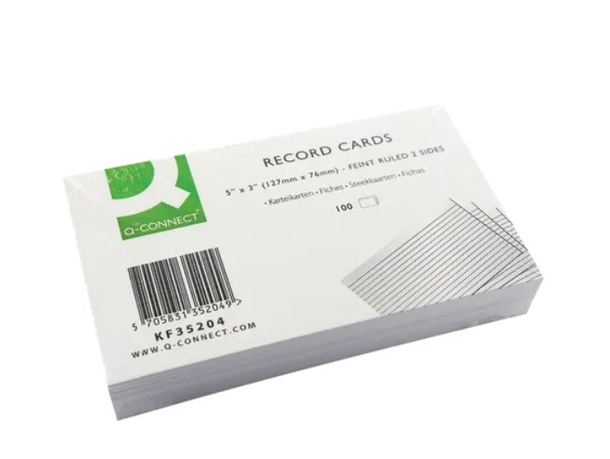 Record Cards can be used for revision, prompts, archiving, indexing and storyboarding. Measuring 127 x 76mm (5 x 3 inches), the cards are feint ruled on both sides, ideal for storing contact information and keeping neat and legible notes. This pack contains 100 record cards, which can be used in conjunction with corresponding Q-Connect Guide Cards and Index Boxes (available separately).